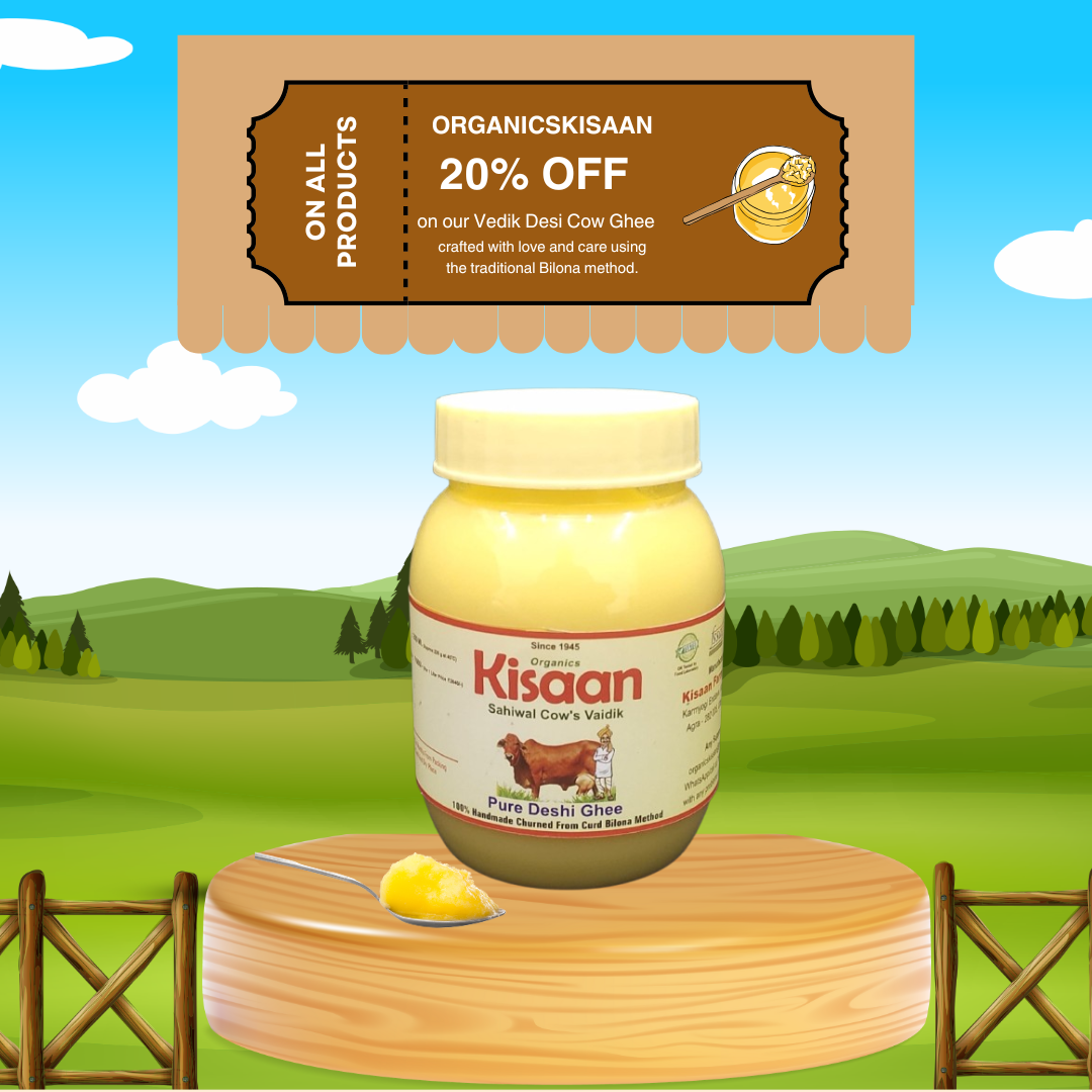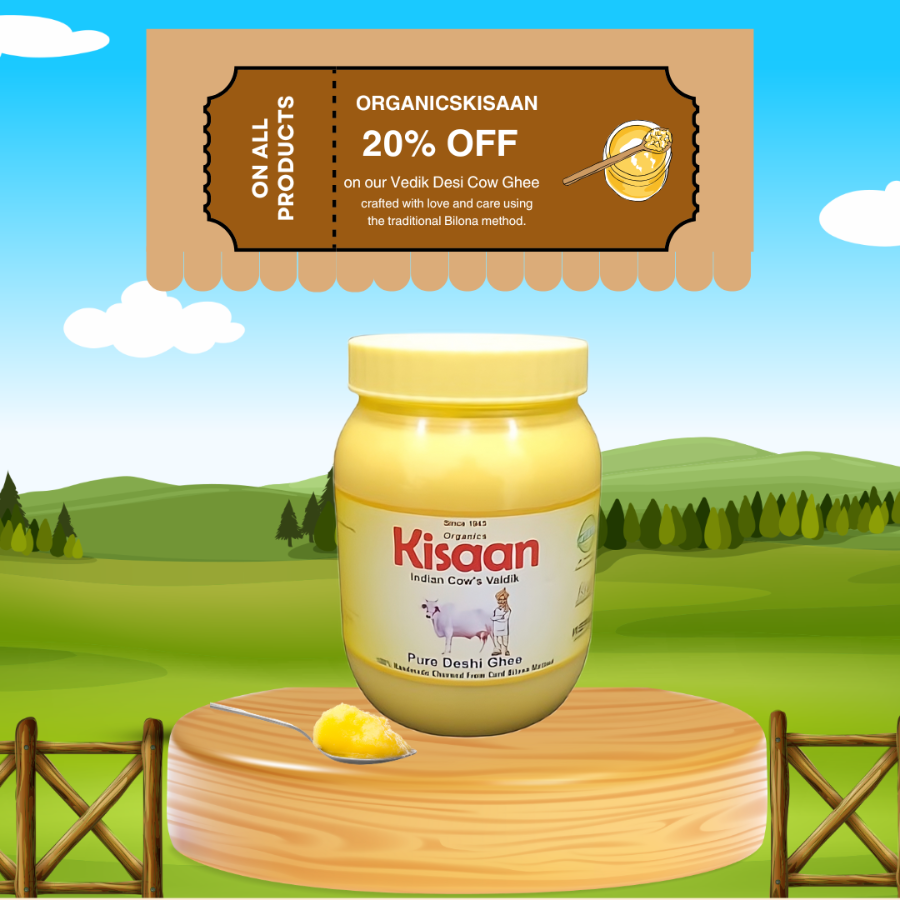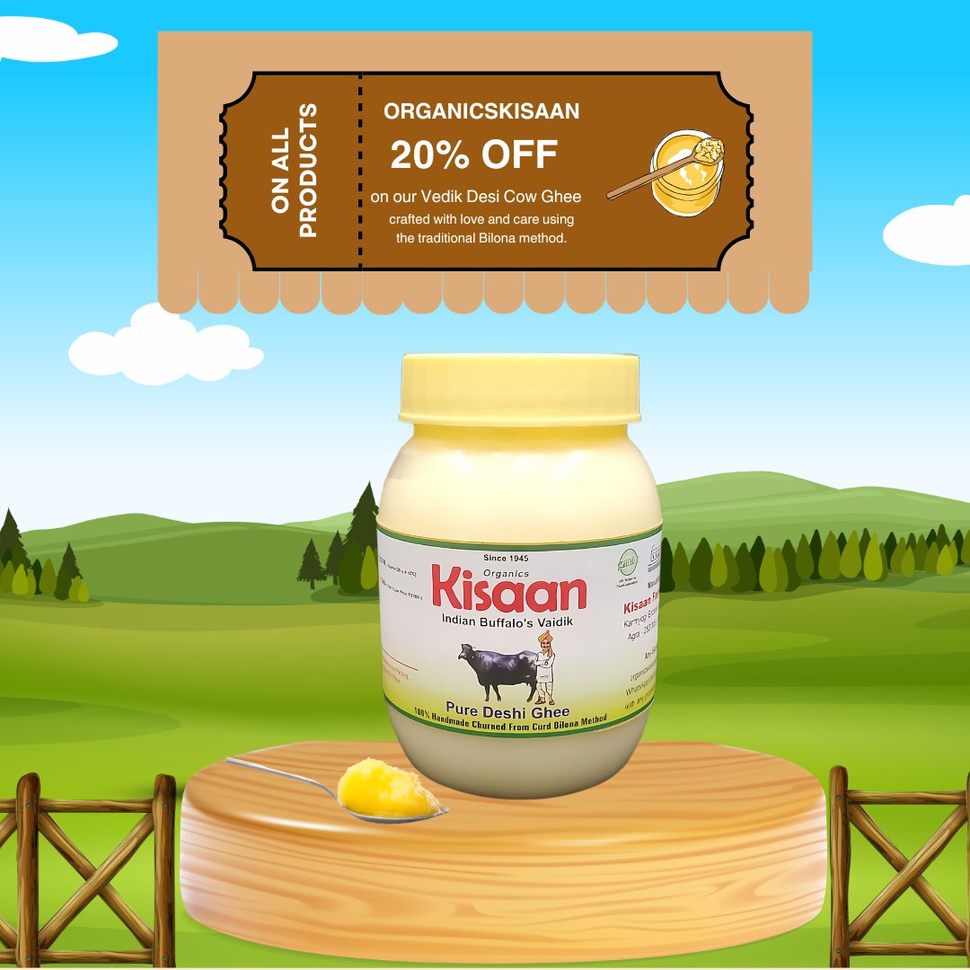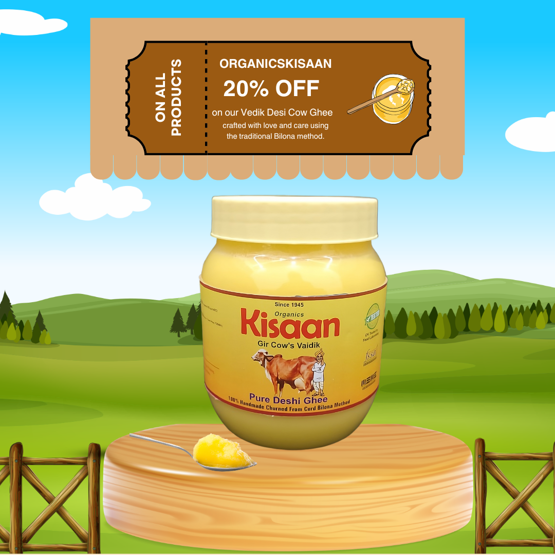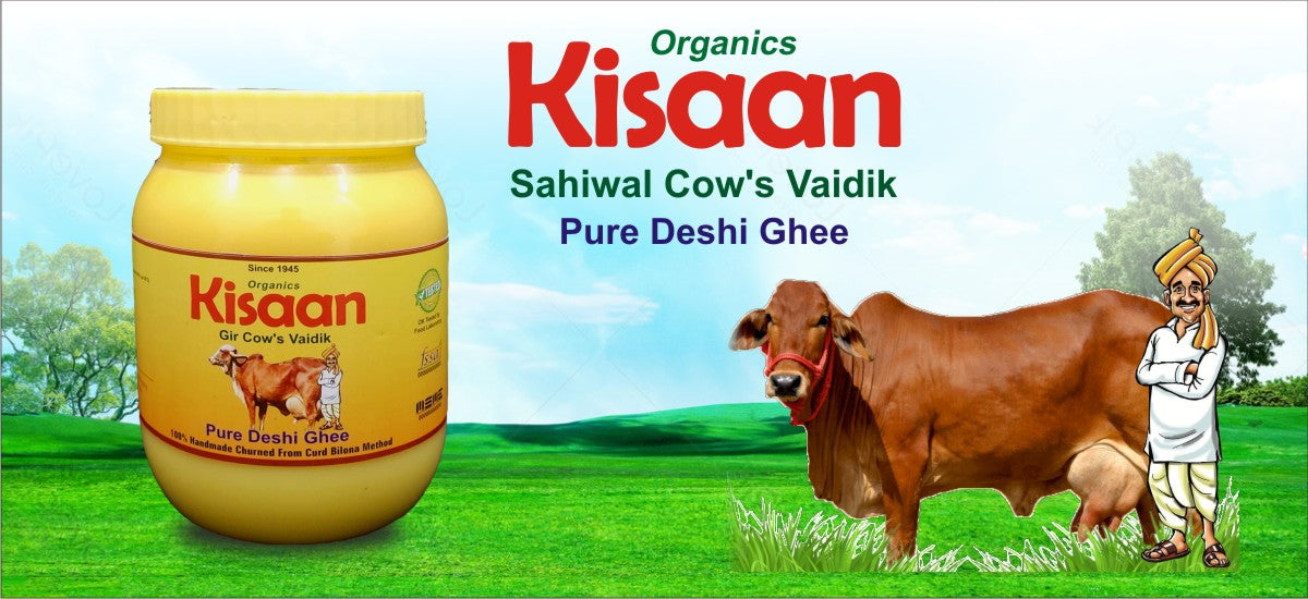At Organics Kissan, we prioritize nature’s harmony. Our cows are raised with love, free from chemicals and fertilizers, using natural cow dung and urine to enrich the soil for a healthier environment. We take pride in our milking techniques, ensuring pure, fresh milk. From this milk, we create premium ghee, offering a rich, wholesome taste. We also ensure calves receive their mother's first milk, promoting healthy growth.Pair text with an image to focus on your chosen product, collection, or blog post. Add details on availability, style, or even provide a review.